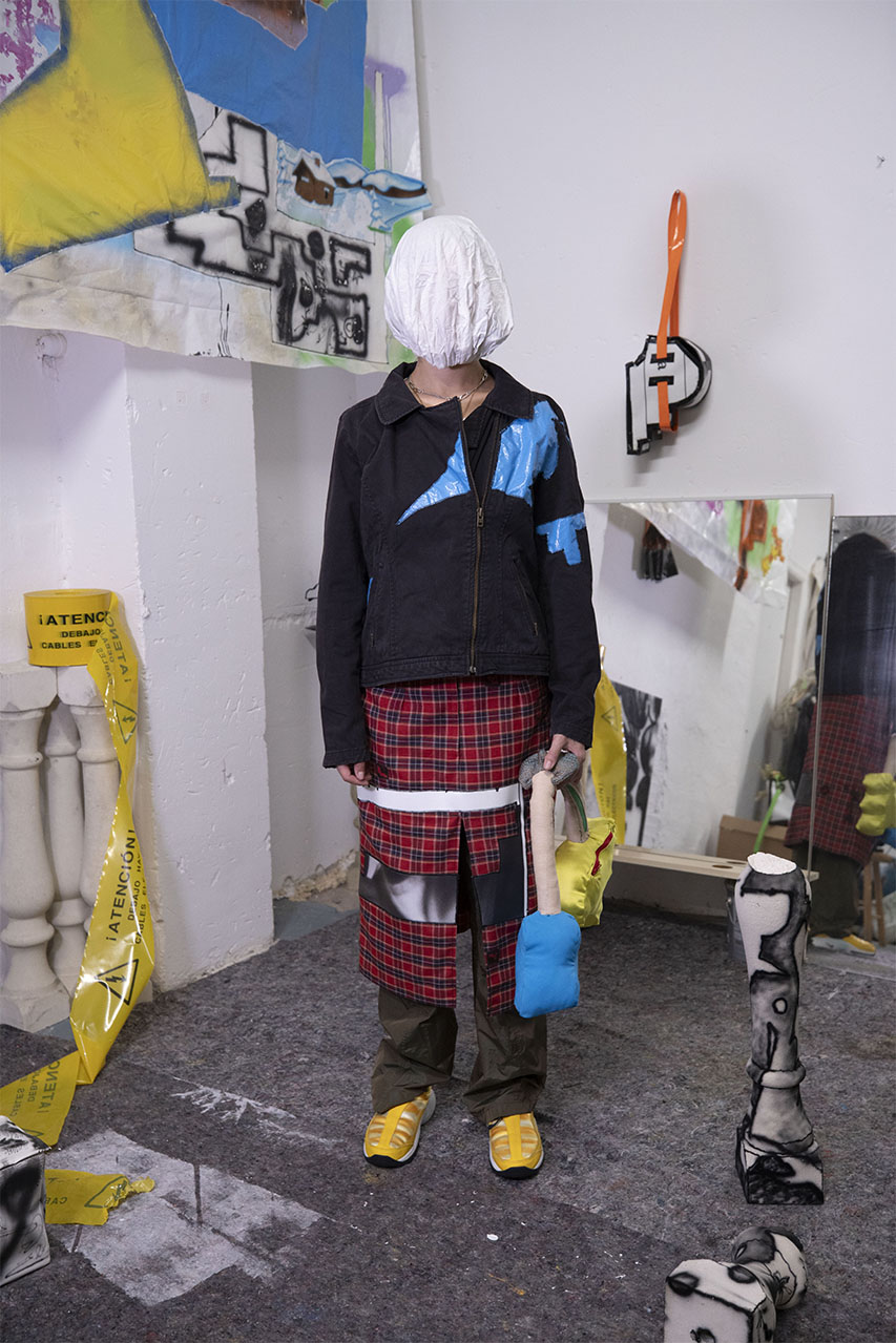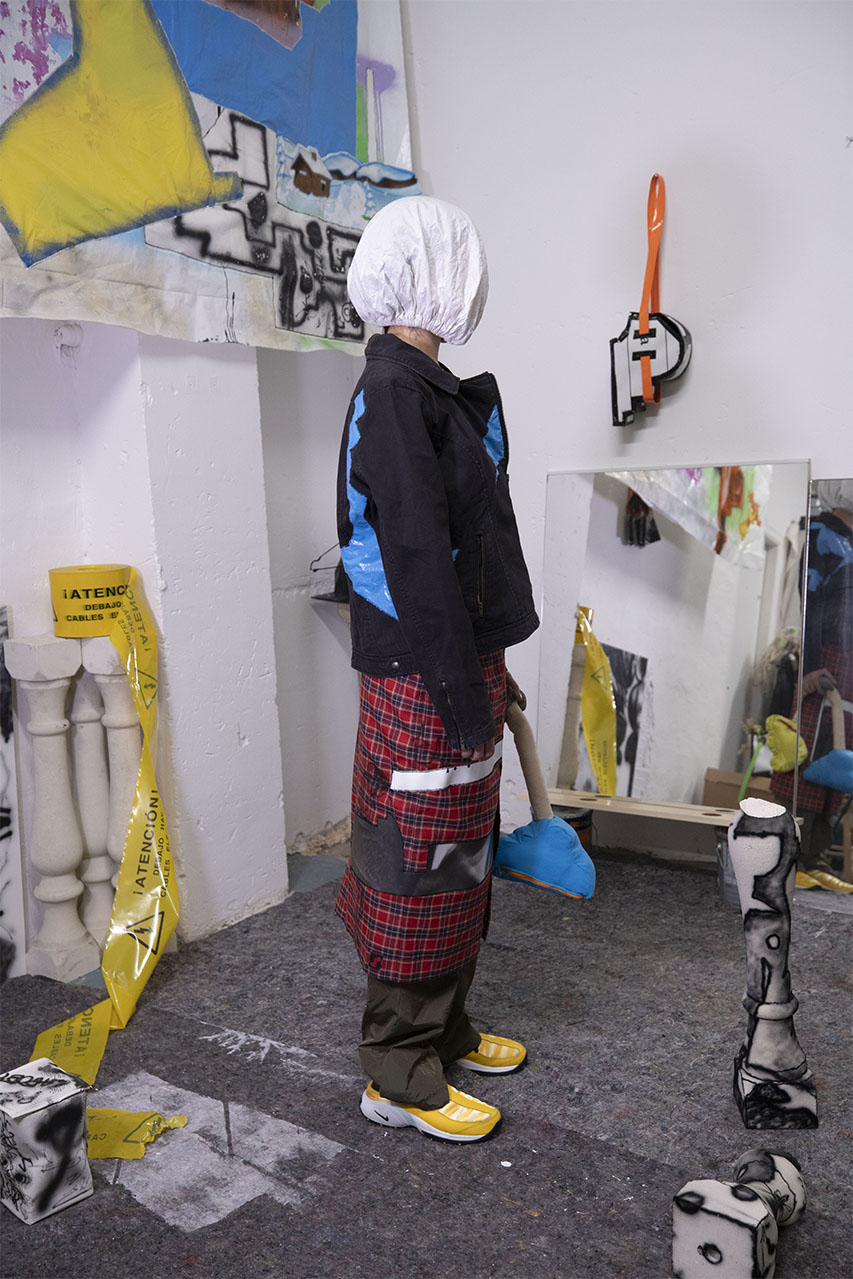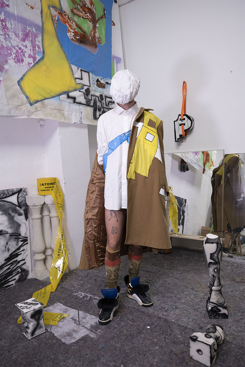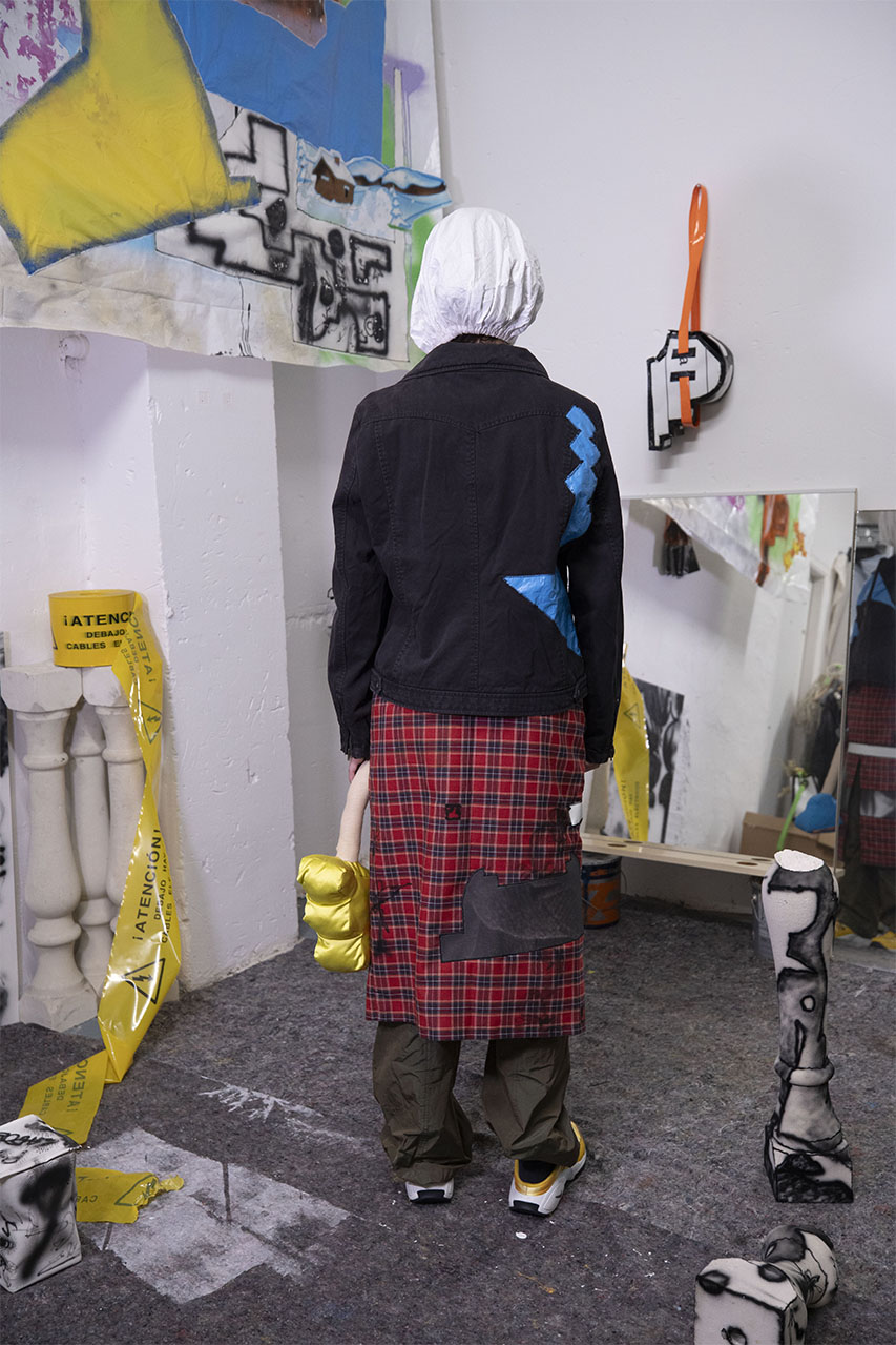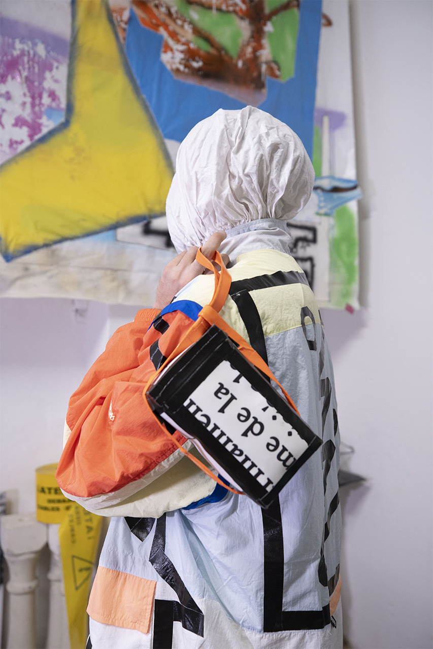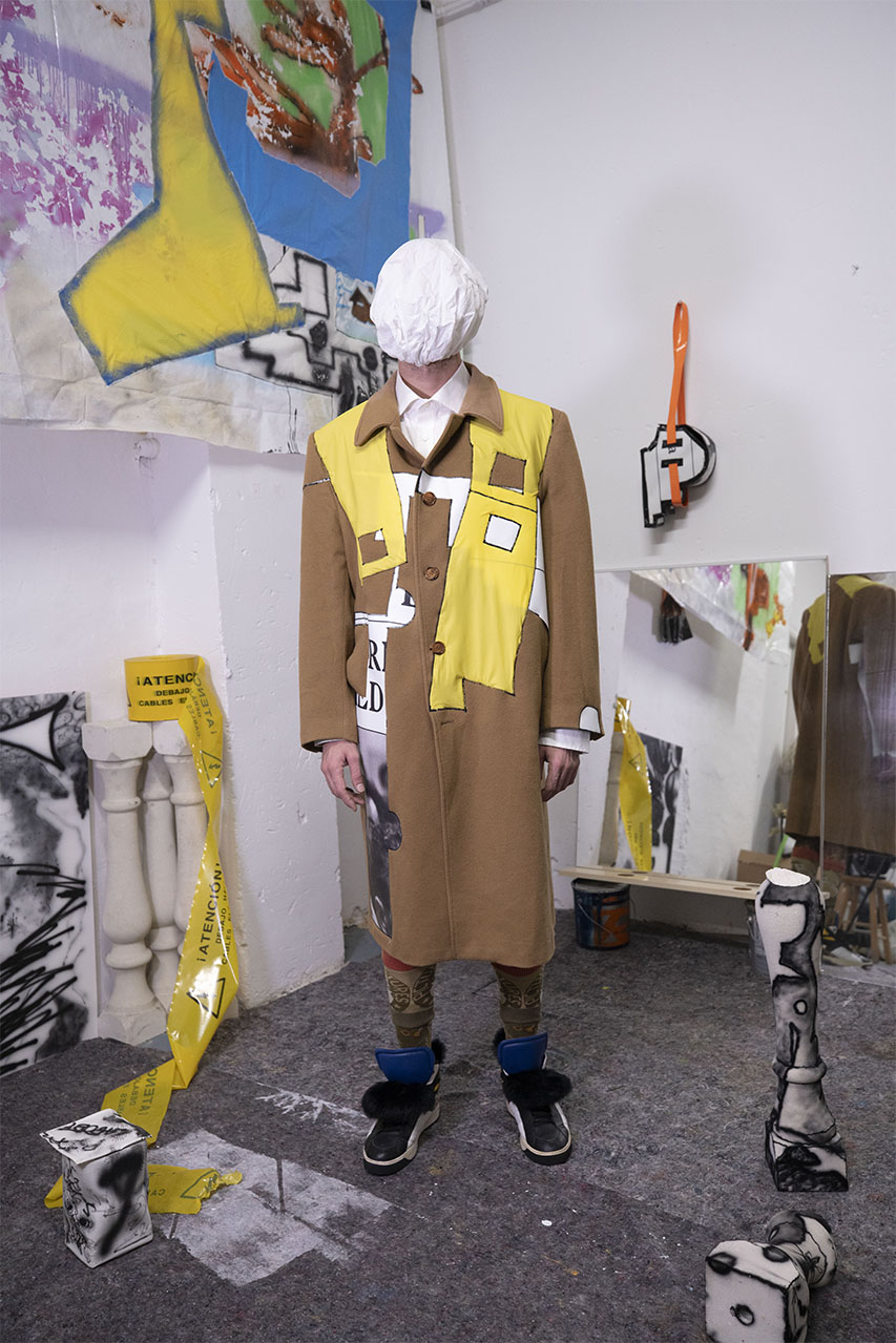 Las formas restantes de realizar cortes generan un negativo igual de sugerente que la pieza final, “objets trouvés” nacen de los descartes de colecciones pasadas. Las grandes dimensiones de estos elementos los vuelve impactantes al combinarse con las prendas, tanto por color como por la composición en la misma.