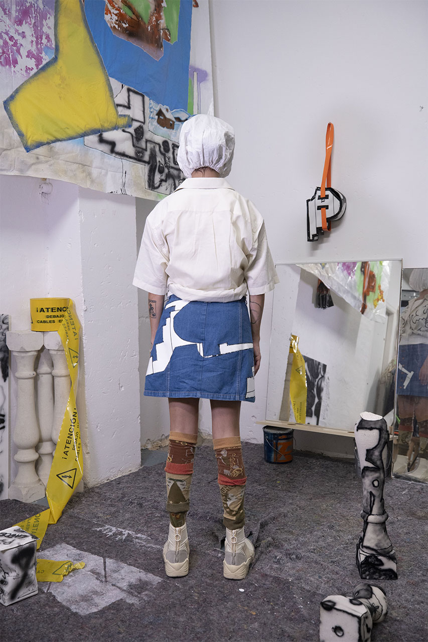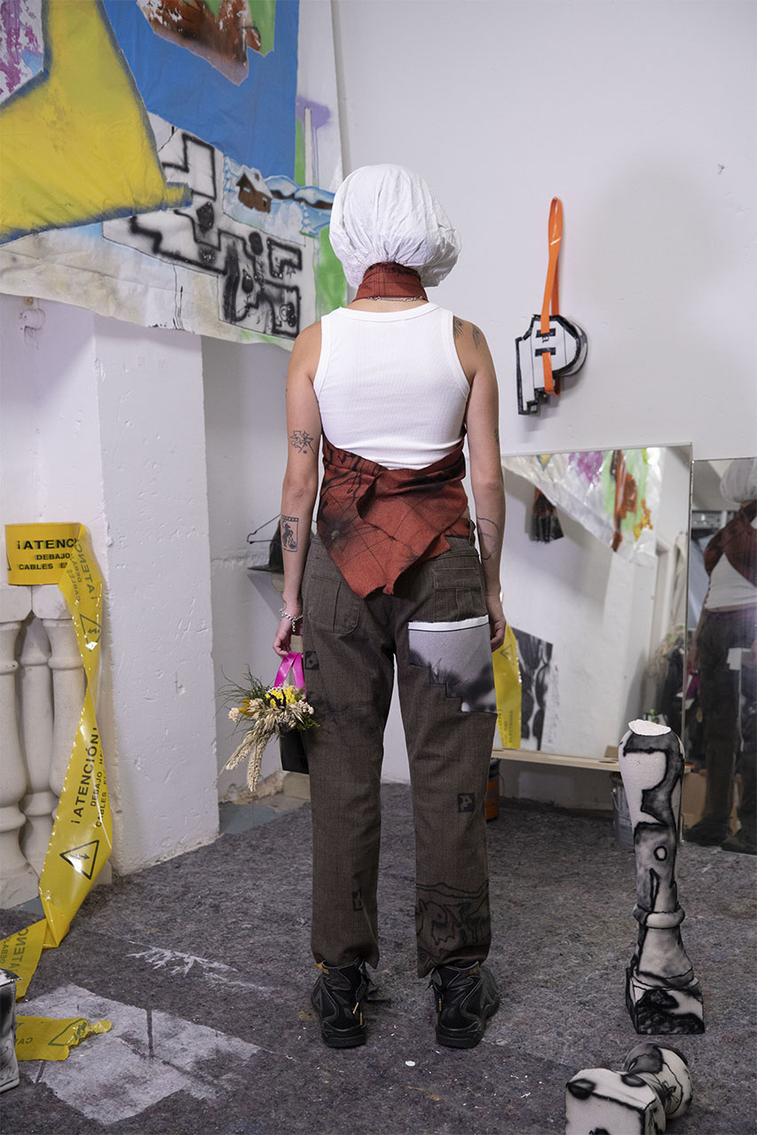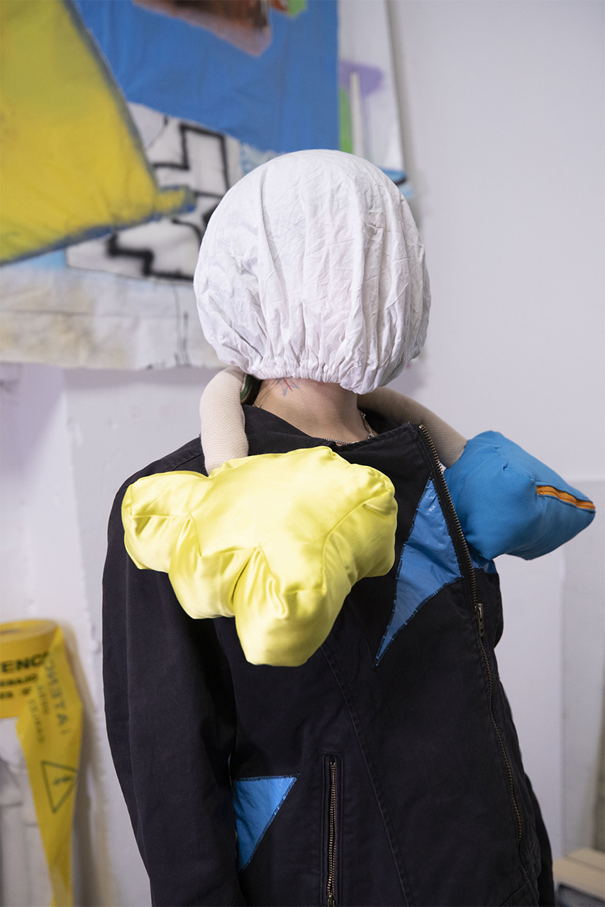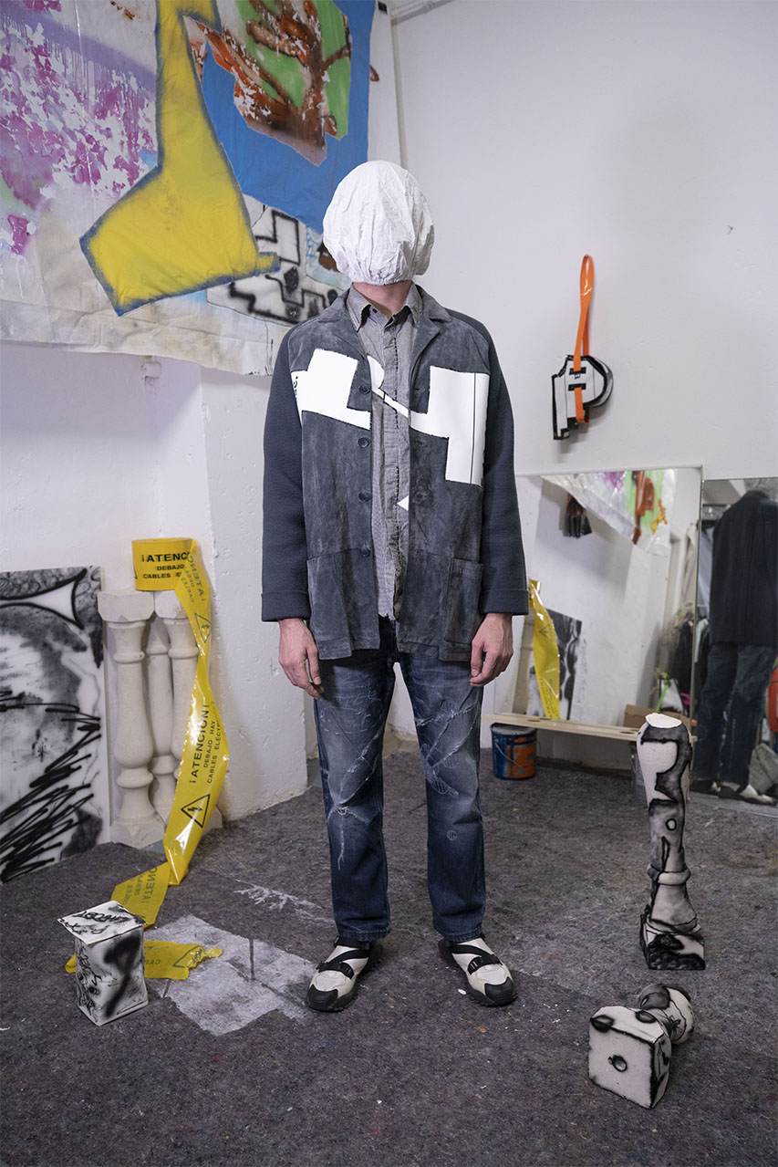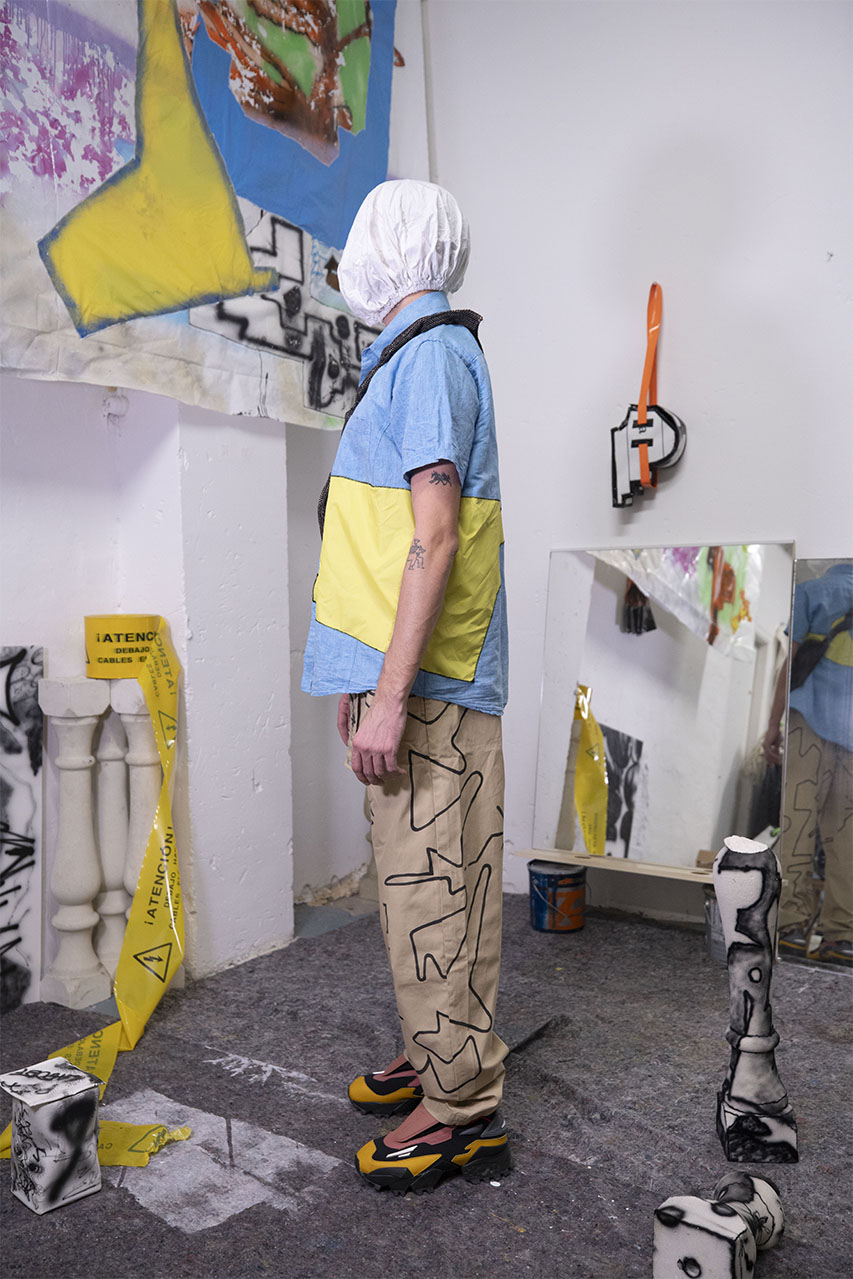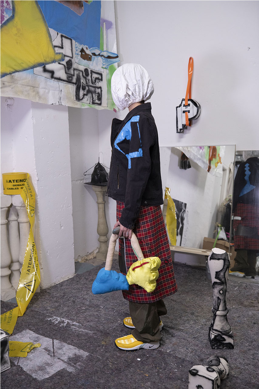 Las formas restantes de realizar cortes generan un negativo igual de sugerente que la pieza final, “objets trouvés” nacen de los descartes de colecciones pasadas. Las grandes dimensiones de estos elementos los vuelve impactantes al combinarse con las prendas, tanto por color como por la composición en la misma.
